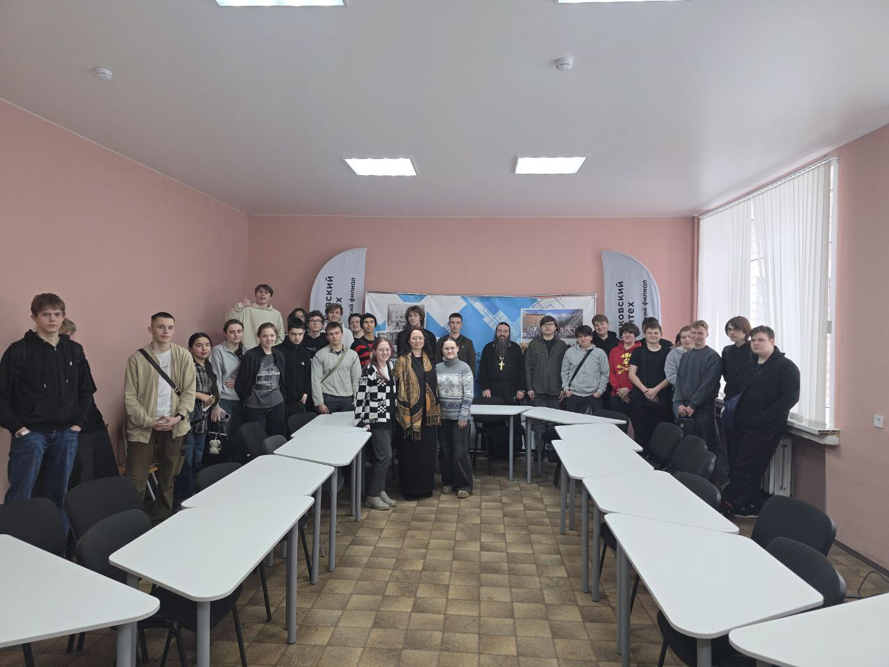 24 февраля в Тучковском филиале Московского политехнического университета состоялась встреча студентов первых и вторых курсов с настоятелем храма Воскресения Словущего села Васильевское протоиереем Игорем Шумиловым.